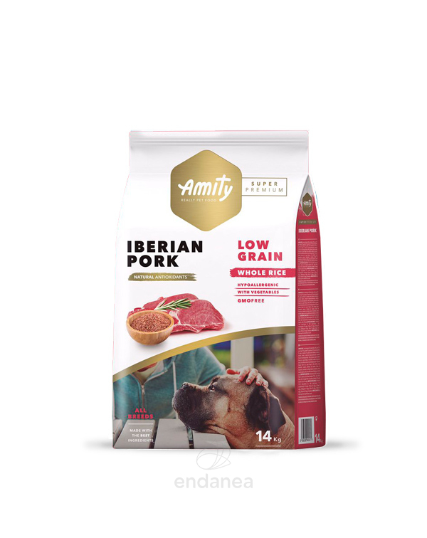 Amity Super Premium Adult Cerdo Ibérico es un pienso para perros adultos con carne de cerdo ibérico. Libre de cereales y hecho con carne de cerdo. La carne es siempre el ingrediente principal de sus piensos. Es un alimento hipoalergénico y está hecho con productos 100% naturales. Entre sus ingredientes encontramos entre otros al arroz integral y las verduras.