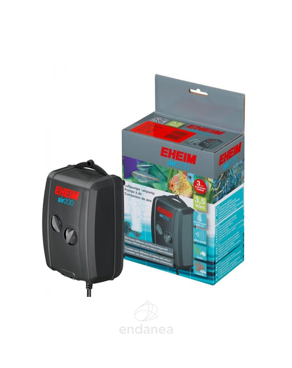 La Bomba de Aire Air Pump 200 de Eheim es un compresor de aire con un funcionamiento muy silencioso. Existen 2 modelos con diferentes rendimientos de la bomba, el de 100 l/h y el de 200 l/h (2 bombas de 100 L). El modelo de 200 dispone de dos salidas de aire regulables. En este modelo al tener dos bombas contiene dos difusores Eheim. También incluyen válvulas antirretorno y la manguera de aire. Los difusores incluidos Eheim también son regulables. Puedes controlar la cantidad de aire por salida directamente desde el aparato y también desde el difusor. Esto te permite ajustar a tu gusto el burbujeo de una manera sencilla y de acuerdo a las necesidades de tu acuario.
