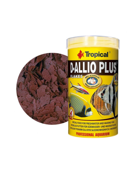 D-ALLIO PLUS un alimento multicomplemental en copos con ajo. Alimento completo en copos con un suplemento de ajo (6%) destinado para los discos y otros peces con exigencias alimentarias, también para peces marinos. En los copos D-Allio Plus se ha utilizado las propiedades del ajo (Allium sativum L.), ya conocidos y respetados desde mucho tiempo. Este complemento natural refuerza los organismos de los peces y favorece los procesos digestivos. Un alto valor nutritivo del alimento, una serie de vitaminas y microelementos seleccionados de la manera óptima y las propiedades del ajo hacen que D-Allio Plus es un alimento indispensable durante las curaciones, convalecencias de los peces y su aclimatación a las condiciones nuevas.