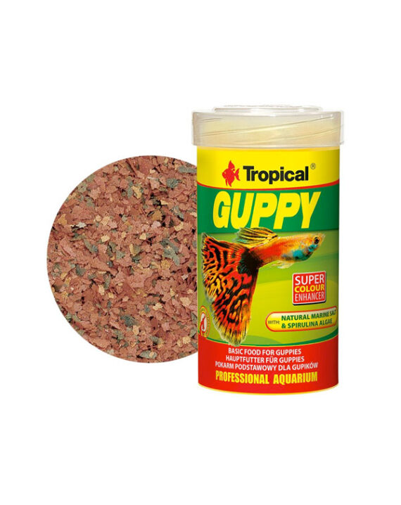 GUPPY un alimento básico con sal marina para los guppys. Alimento completo y básico en forma de escamas para la alimentación diaria de los guppys y otros peces vivíparos. El alimento fue enriquecido con sal marina natural que favorece el nivel de electrólitos y la presión osmótica que influyen directamente en el desarrollo del embarazo, el parto y la condición de los alevines y sus padres.