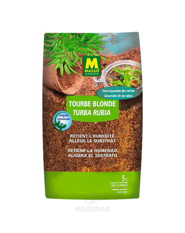 La Turba Rubia Massó 5 L es una turba natural seleccionada. Procedente de la descomposición parcial anaeróbica natural de acumulaciones de Sphagnum de calibre medio. El sphagnum es un sustrato natural de origen vegetal que posee múltiples propiedades. Posee una gran capacidad de retención de agua y aireación. Además, complementa el sustrato mejorando las propiedades del suelo en huertos y jardines.